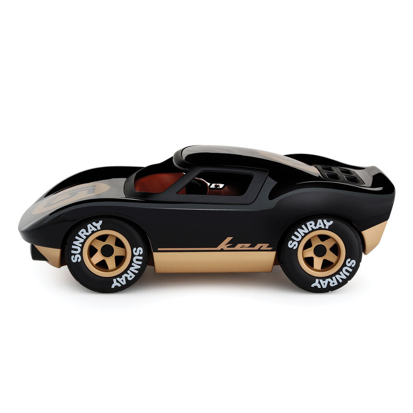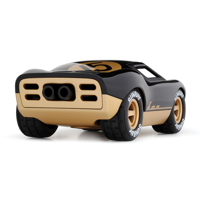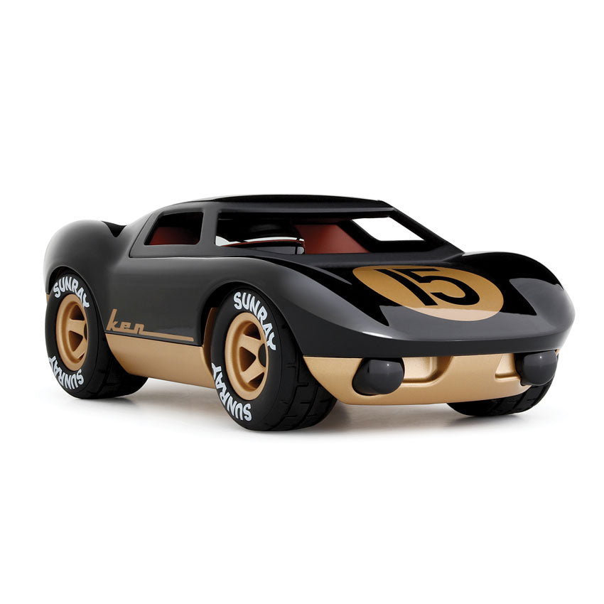 Ken Cave in black and gold is poised to be the king of the road! With a sleek jet black gloss body, matching dual exhaust pipes, and striking gold accents on the racing number roundel and 5-spoke wheels, this car exudes ultimate style! The driver, sporting a chrome helmet, is dressed for the podium and ready to claim victory. Perfect for the cool kids of all ages.